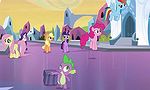 Célestia annonce à son étudiante préférée que ce miroir mène à un monde parallèle. Bien évidemment, Rainbow Dash, Applejack, Pinkie Pie, Rarity et Fluttershy veulent absolument accompagner Twilight dans son expédition, hélas les souveraines de Equestria leur disent que si elles y allaient toutes, l'équilibre de ce monde parallèle serait rompu et que seule Twilight doit y aller pour récupérer sa couronne. Elle emprunte alors le miroir... Et Spike à la toute dernière seconde bondit dans le miroir, ne pouvant se résoudre à laisser son amie partir seule dans ce monde inconnu.