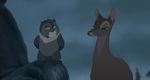 Aussi, le studio a instauré beaucoup de clins d'œils au premier film et ceux-ci prennent une tournure particulièrement ironique quand ils sont reliés à des événement reliés à la partie de l'histoire où Bambi est adulte (et qui sont donc postérieurs chronologiquement aux événements du deuxième film). Ainsi, on comprend clairement que Ronno n'est autre que le cerf que Bambi adulte affronte en duel dans le premier film mais on a aussi la surprise de constater qu'utiliser des pierres pour se débarrasser de chiens de chasse est une ruse que notre héros avait déjà expérimentée dans sa jeunesse ! Le film a également eu la bonne idée de mettre plusieurs scènes de rapprochement avec Féline, rendant ainsi leur union dans la seconde moitié du premier film moins abrupte.
